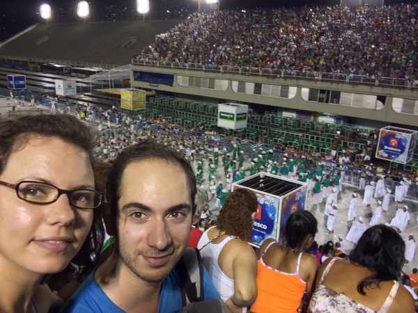 Le soir, nous traversons la ville à pieds jusqu’au sambodrome pour assister à une autre répétition in situ, tous le monde danse et chante en affichant les couleurs de l’école de samba de son quartier. Nous avons passé une soirée inoubliable!